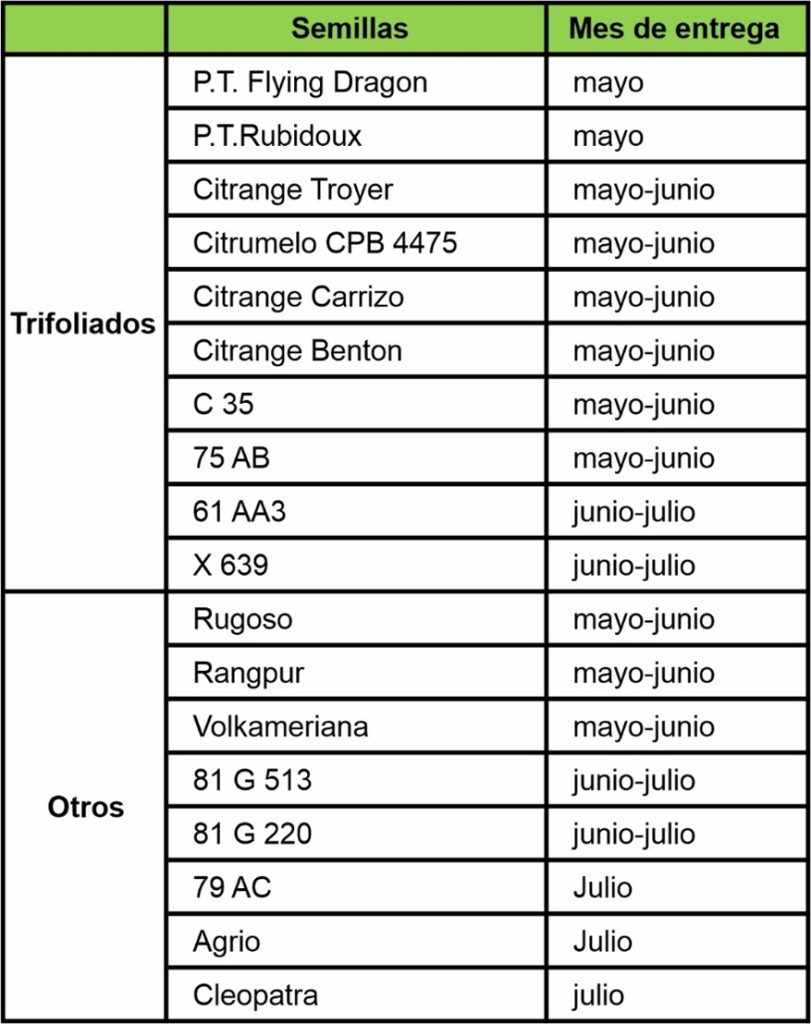 Estimativamente, se detalla a continuación las fechas de entrega de las variedades de portainjerto
